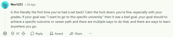 “这是你第一次遇到挫折吗?冷静点,你没事的,尤其是你的成绩这么好。如果你的目标只是‘我想去这所特定的大学’,那其实是个不太合理的目标。你的目标应该是实现一个具体的结果或者职业发展,而实现这个目标有很多途径,而且无论你去哪,都能学到东西。”