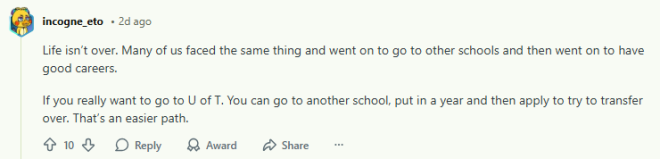 “生活没有结束。我们很多人都经历过类似的事情,后来去了其他学校,最终也都有了不错的职业发展。如果你真的很想去多伦多大学,你可以先去另一所学校读一年,然后再申请转学过去。这条路会更容易一些。”