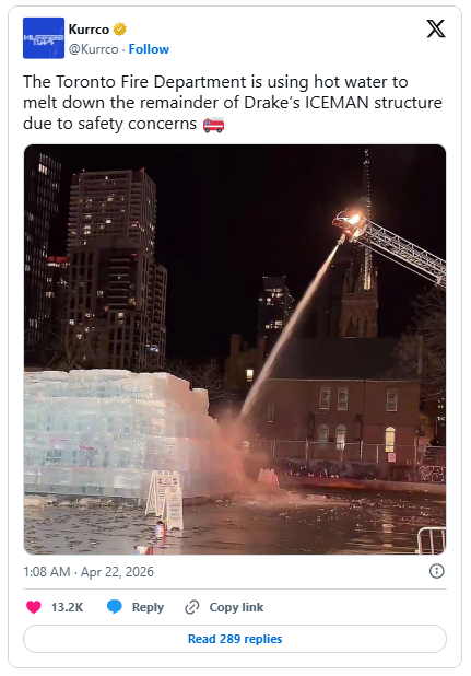 过去两天在多伦多引发轰动的 Drake 巨型冰块宣传活动,因安全隐患被市政府紧急叫停。事实证明,把电锯和喷火器带到多伦多市中心停车场,并不是当地居民能接受的行为。