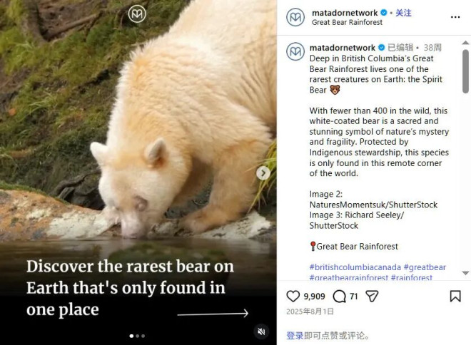 在大熊雨林的深处,栖息着这种地球上最稀有的生物之一:灵熊 (Spirit Bear),这种身披白毛的熊在野外数量不足400只,是自然界神秘与脆弱性的神圣而令人惊叹的象征。在当地原住民的守护下,这一物种仅存于这片世外桃源般的偏远之地。