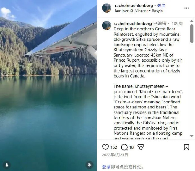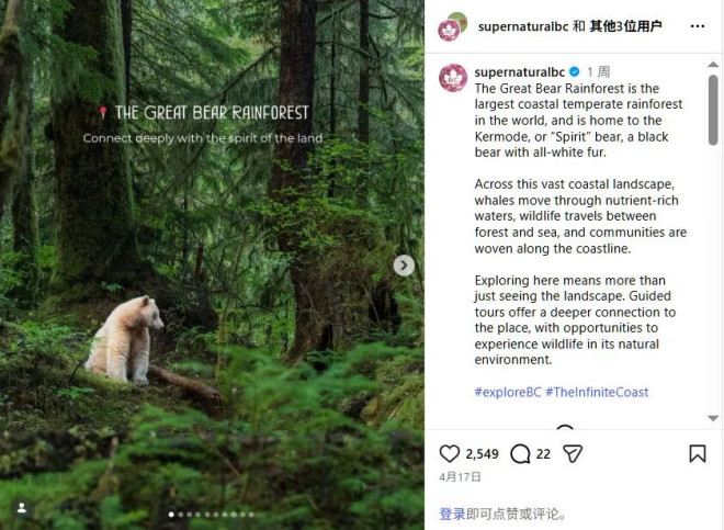 “大熊雨林绵延于BC省偏远的太平洋沿岸,是地球上最后几片伟大的温带生态荒野之一,涵盖了5万平方英里的雨林、峡湾与人迹罕至的地区”,CN Traveller表示。