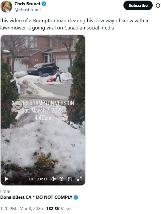 这段视频之所以迅速走红,很大程度上是因为记者Chris Brunet在社交媒体上的一条帖子。他写道:“这段视频显示,一名宾顿(Brampton)男子用割草机清理自家车道上的积雪,目前正在加拿大社交媒体上走红。”