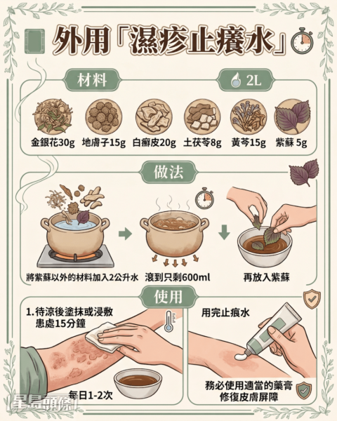 他指出,湿疹一般可以分为“急性期”、“亚急性期”和“慢性期”3个阶段。不同时期有不用处理方法,包括洗剂、药膏等,并根据证型和体质内服中药调理。另外亦要保持良好的生活和饮食习惯,持之以恒。他分享一款外用的“湿疹止痒水”药方,适合急性和亚急性湿疹患者,及时缓解痕痒,避免皮肤屏障受损更严重。