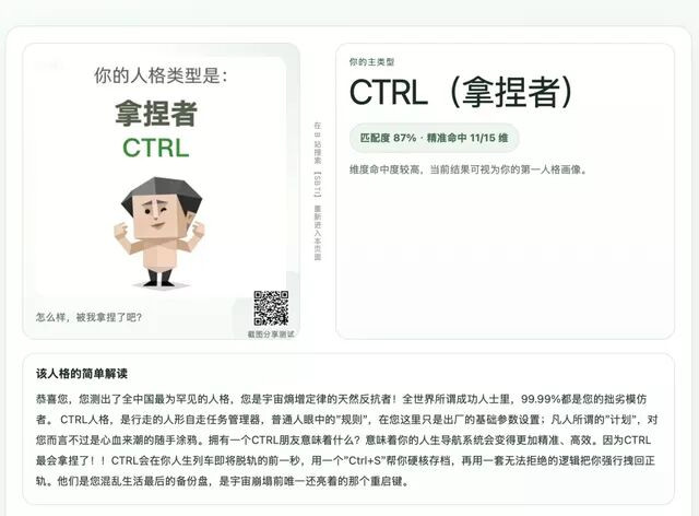 引发更多人共鸣的,是那些荒诞又无厘头的测试结果。它用幽默戏谑的标签,取代了原本一本正经的人格类型。